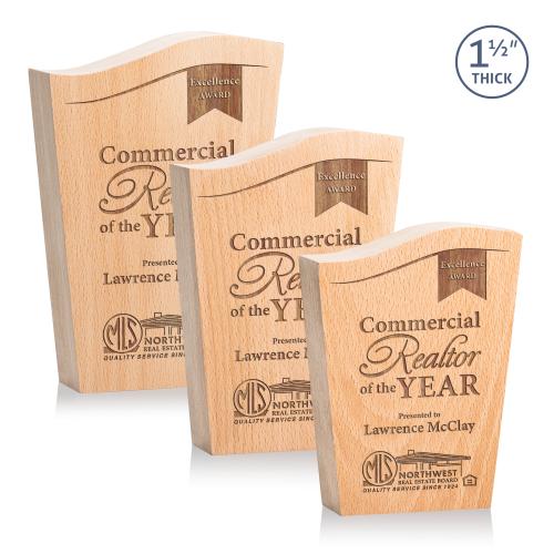 The **1.5" thick** freestanding Woburn Award is a stunning tribute to excellence that combines the warmth of natural Beechwood with a modern and artistic design. This award stands out with its unique contoured wave top, adding a touch of fluidity and sophistication to the traditional recognition piece.