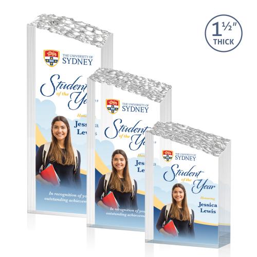The Warwick VividPrint Award features a solid 1.5" thick Acrylic tower with a slanted top featuring a molded mountainous texture. A striking recognition piece to honor a monumental achievement.