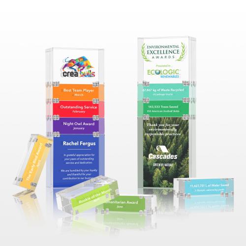 Elevate recognition to a new level with our Derringer VividPrint Award. Its unique stackable design symbolizes growth, progress, and the potential for even greater heights. Perfect for years of service, sales achievements, or any landmark event! This Acrylic award includes 3 pieces: the bottom block, top block, and 1 stacking block. Additional blocks optional. Make a colorful statement with Double-Sided VividPrint!