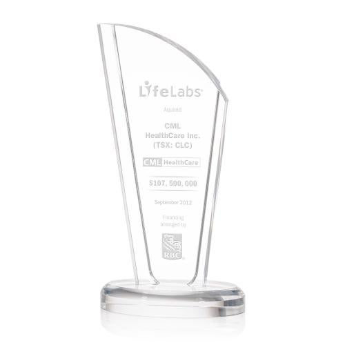 The Bridgewood Award is a magnificent tall solid clear Acrylic accolade perfect for recognizing an outstanding performance, or, commemorating a milestone event. This award showcases a sleek and modern design, combining a classic clear oval base with contemporary elements. The side panels add depth and dimension to the piece, creating a visually stunning effect.