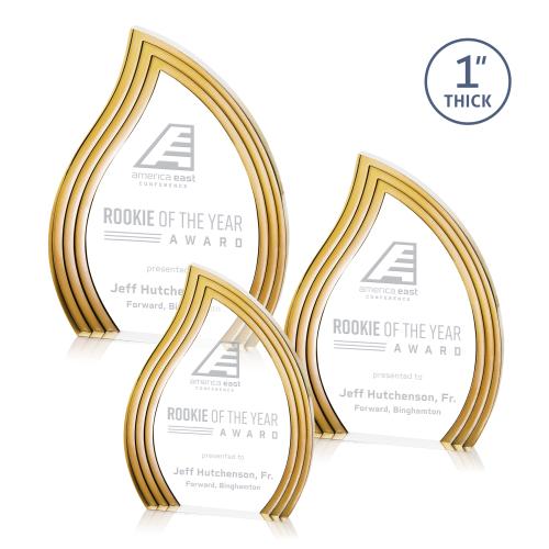 The Tidworth Award is a striking freestanding acrylic piece designed in a graceful flame-inspired shape that symbolizes energy and achievement. Its clear acrylic center is framed by bold gold accents, creating a vibrant contrast that enhances its modern elegance. With its flowing curves and brilliant finish, this award is a standout choice for honoring excellence. Available in clear, ruby, sapphire, emerald and gold.