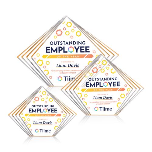 The Crawford VividPrint Award is a sleek freestanding acrylic recognition piece featuring a modern diamond-shaped design with layered side accents that create depth and visual interest. Crafted from clear, high-quality acrylic, it offers a generous decorating area perfect for full-color graphics, logos, or personalized messages. Contemporary and versatile, the Crawford Award delivers a bold, eye-catching presentation ideal for celebrating excellence, achievement, and standout performance. Bring your artwork to life with full-color VividPrint!