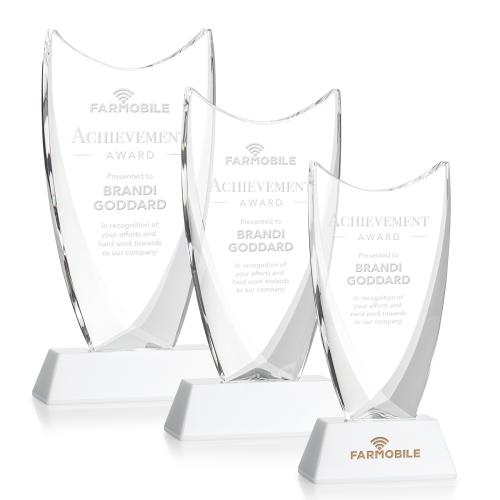 The Dawkins features deep, curved bevels on the back of a clear optical crystal upright, tapering toward the ends of the concave top. The highly polished curves and flaring bevels emphasize the flawless clarity and sparkle of optical crystal. Mounted on a solid White Crystal tapered base. Second position etch optional.