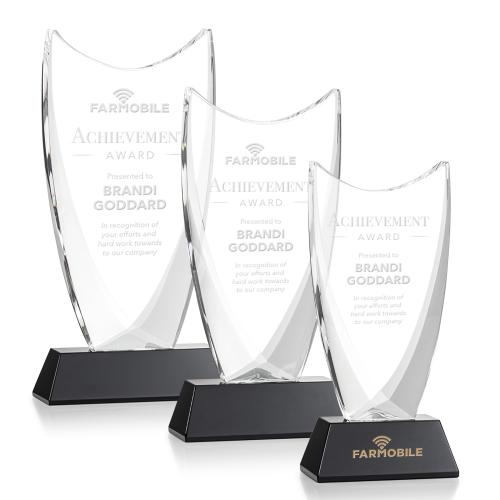 The Dawkins features deep, curved bevels on the back of a clear optical crystal upright, tapering toward the ends of the concave top. The highly polished curves and flaring bevels emphasize the flawless clarity and sparkle of optical crystal. Mounted on an Ebony Crystal tapered base. Second position etch optional.