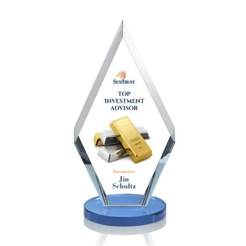 This simple yet elegant starfire diamond award features deep interchanging bevels and is mounted on a sky blue starfire base.