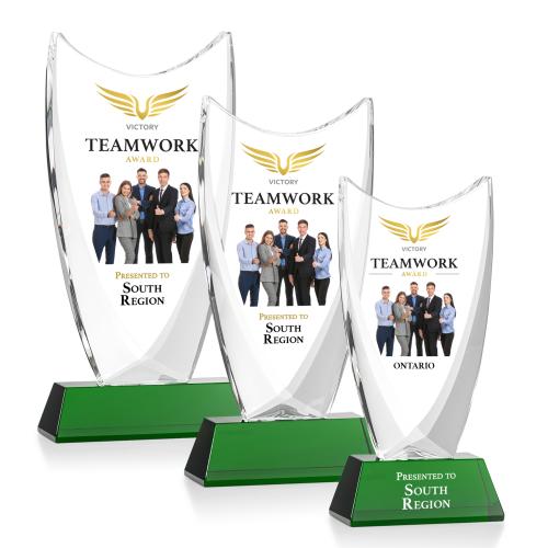 The Dawkins features deep, curved bevels on the back of a clear optical crystal upright, tapering toward the ends of the concave top. The highly polished curves and flaring bevels emphasize the flawless clarity and sparkle of optical crystal. This award imprinted with vibrant full color VividPrint and mounted on a green optical base. Second position etch optional.