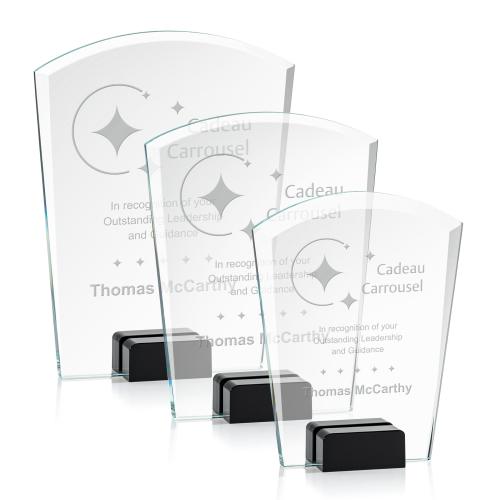 Striking Starfire Crystal Lola Award features a tapered and curved top, enhanced with a beautiful bevel and propped between two blocks of colored crystal for an stunning recognition piece to honor a special achievement.