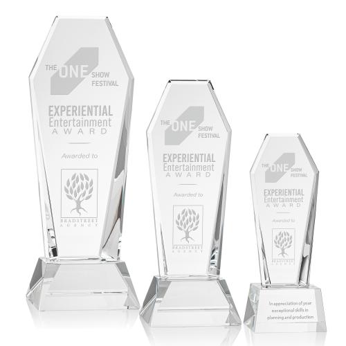 The spectacular Romford is a tall statuesque Optical Crystal award with double sided beveled edges. Mounted on an Optical Crystal base. Second position etch and colorfill optional.