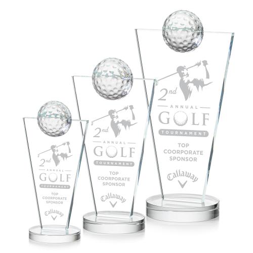 Celebrate your tournament champions or a masterful stroke with the Slough Golf awards. Featuring an Optical Crystal Golf Ball perched atop a pane of starfire crystal that tapers down to a round crystal base.