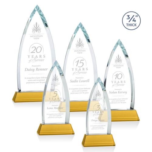 The striking Shildon Award is a 3/4" thick Starfire arrowhead with deep dramatic bevels to recognize a spectacular achievement. Mounted on a thick amber crystal base. Second position etch optional.
