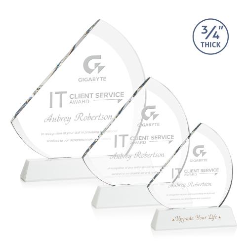 The contemporary Nantucket Award is made from thick 3/4" Starfire Crystal with contrasting deep bevels that rise to a flat edge. This striking work of recognition is mounted on a tall solid white crystal base and is a magnificent award to honor a top performer. Second position etch optional.