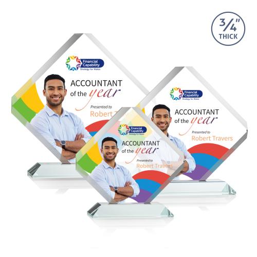 The majestic Toulon VividPrint award is a brilliant diamond-shaped award with a dramatic beveled frame and clipped edges. Ideal for recognizing an exceptional performer or commemorating a momentous milestone or event. Available on your choice of clear or colored mitered base.