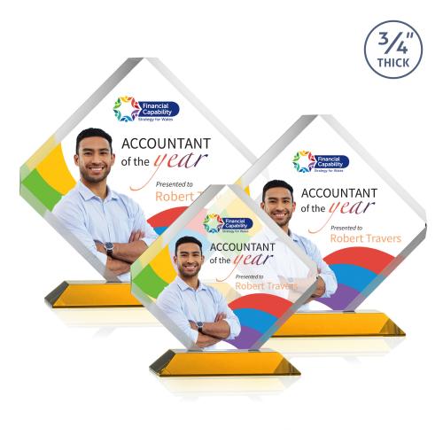 The majestic Toulon VividPrint award is a brilliant diamond-shaped award with a dramatic beveled frame and clipped edges. Ideal for recognizing an exceptional performer or commemorating a momentous milestone or event. Available on your choice of clear or colored mitered base.