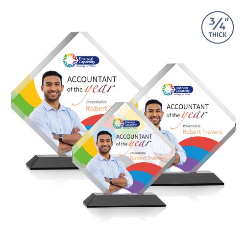 The majestic Toulon VividPrint award is a brilliant diamond-shaped award with a dramatic beveled frame and clipped edges. Ideal for recognizing an exceptional performer or commemorating a momentous milestone or event. Available on your choice of clear or colored mitered base.