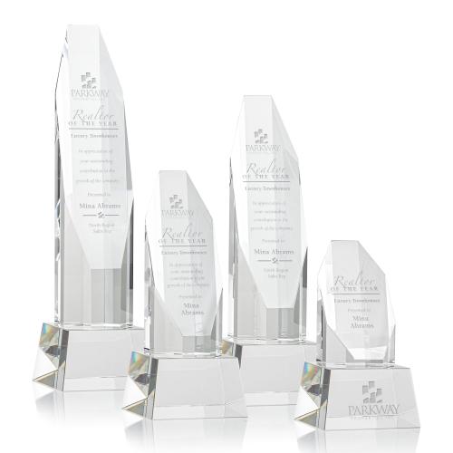 The exquisite Barrhaven Optical Crystal Award features a tall multi-faceted obelisk with a sheered-off octagonal front that creates a stunning diamond-shaped surface to inscribe your exceptional achievement. Mounted on an optical crystal tapered base. Second position etch & colorfill optional.