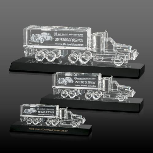 Honor the best in transport with the Optical Crystal 18 Wheeler 3D Award! Manufactured from hundreds of hand polished faceted pieces all intricately assembled and features beautiful 3 Dimensional etching inside the crystal. Mounted on a 3/4" mitered Black Base, this award makes for a very unique piece perfect for honoring milestones for company drivers, transportation companies, years of service and any recognition within the logistics and transportation industries. Second position deep etch & colorfill optional.