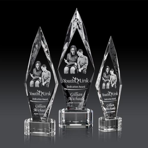 This beautifully beveled, arrowhead-shaped Manilow Optical Crystal award is mounted on our Paragon Crystal Base in your choice of Clear, Black, Blue or Green. Turn your award into a magnificent work of art with Dimensions 3D subsurface etch.