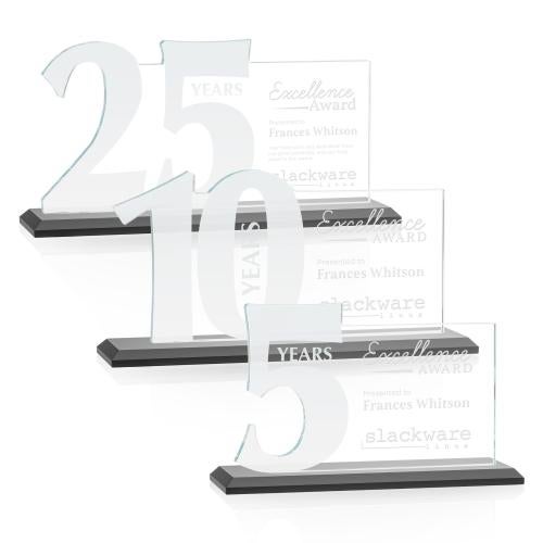 Honor loyalty and dedication with our fantastic Hazelton Years of Service awards. Recognizing major milestones from 5 to 25 years, these Starfire crystal awards feature beautiful contoured and frosted numbers in 5-year increments with a large horizontal pane to hand deep-etch your words of appreciation. Available on your choice of clear or colored base.