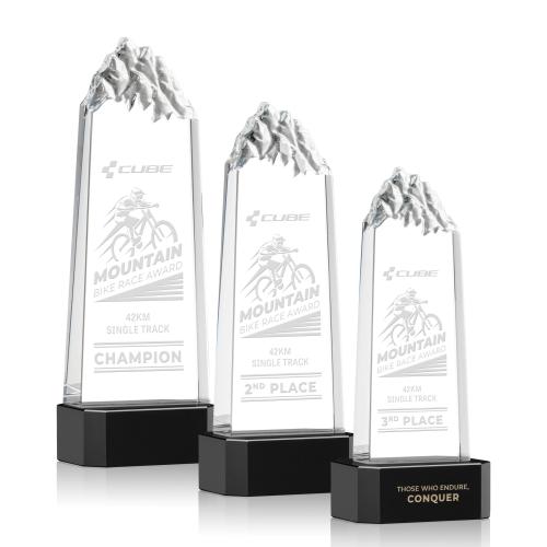 The Himalayas Tower Award is for the individual who exceeds limits and accepts every challenge to get to the top! This freestanding thick Optical Crystal Tower features chiseled mountain peaks at the top of the award. Complete with a sapphire, emerald, ebony, or clear thick Optical Crystal base. Second position etch and colorfill optional.