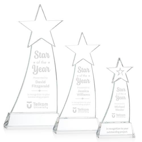Crafted from premium Optical Crystal, the Manolita Star Award boasts a flawless clarity that refracts light with captivating brilliance. Its gracefully curved shape adds a modern touch, while the star at the pinnacle crowns the achievement with celestial significance. Mounted on your choice of clear or colored Optical Crystal Base. Packaged in a black satin-lined presentation gift box. Second and third position etch optional.