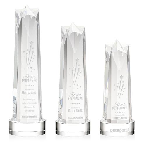 The Ellesmere Star Obelisk on Base is a stunning piece of recognition artistry crafted from Optical Crystal. Crowning this exquisite award is a flat star face, meticulously cut and polished to perfection. Its flat surface serves as a canvas for personalized engraving, allowing for a bespoke touch that commemorates the recipient's remarkable success. Complete with a Clear, Emerald, Ebony, or Sapphire Optical Crystal Base. 2nd Position Etch Optional.