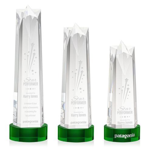 The Ellesmere Star Obelisk on Base is a stunning piece of recognition artistry crafted from Optical Crystal. Crowning this exquisite award is a flat star face, meticulously cut and polished to perfection. Its flat surface serves as a canvas for personalized engraving, allowing for a bespoke touch that commemorates the recipient's remarkable success. Complete with a Clear, Emerald, Ebony, or Sapphire Optical Crystal Base. 2nd Position Etch Optional.