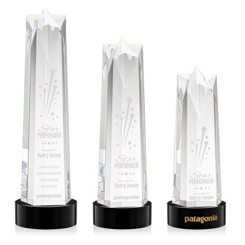 The Ellesmere Star Obelisk on Base is a stunning piece of recognition artistry crafted from Optical Crystal. Crowning this exquisite award is a flat star face, meticulously cut and polished to perfection. Its flat surface serves as a canvas for personalized engraving, allowing for a bespoke touch that commemorates the recipient's remarkable success. Complete with a Clear, Emerald, Ebony, or Sapphire Optical Crystal Base. 2nd Position Etch Optional.
