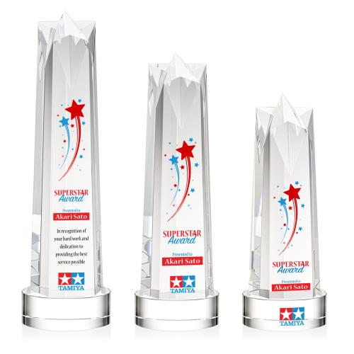 The Ellesmere VividPrint Award on Base is a stunning obelisk of recognition artistry crafted from Optical Crystal. Crowning this exquisite award is a flat star face, meticulously cut and polished to perfection. Its flat surface serves as a canvas for personalized engraving, allowing for a bespoke touch that commemorates the recipient's remarkable success. Complete with a Clear, Emerald, Ebony, or Sapphire Optical Crystal Base. 2nd Position Decoration Optional.