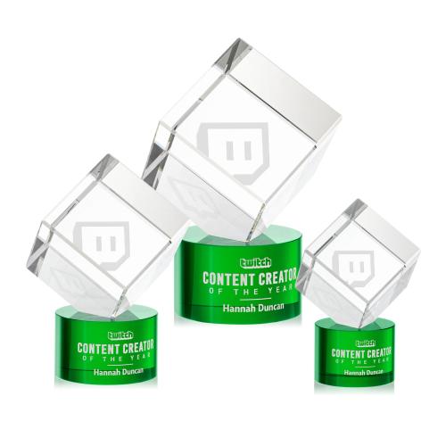 A perfectly polished cube made from the purest Optical Crystal. Features a subtle single beveled edge all around. Let this recognition piece shine as an award, paperweight or momento for your desk or shelf. Complete with your choice of Clear, Ebony, Emerald, or Sapphire round Optical Crystal base.
