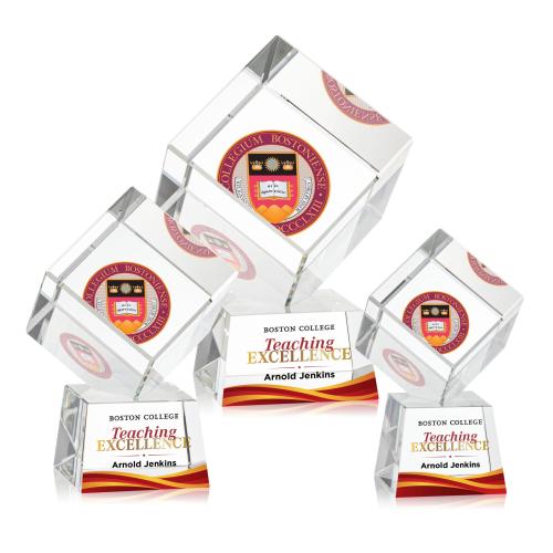 A perfectly polished cube made from the purest Optical Crystal. Features a subtle single beveled edge all around. Let this recognition piece shine as an award, paperweight or momento for your desk or shelf. Complete with your choice of Clear, Ebony, Sapphire, or Emerald tapered Optical Crystal base. Let your message POP! with full color VividPrint.