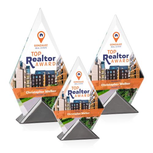 Crafted from Starfire crystal, the Andria VividPrint Award takes the form of a dazzling diamond with beveled edges, creating a prism-like effect that refracts light and radiates brilliance. Mounted on a triangular gunmetal base, this award achieves the perfect balance between classic and contemporary. The sleek gunmetal finish provides a striking contrast to the crystal, creating a visually captivating piece that demands attention. Let your artwork shine with full-color VividPrint.