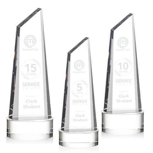 Stunning trapezoidal tower award is anchored with a thick optical crystal bottom that tapers to a peak. Mounted on your choice of Clear, Emerald, Ebony, or Sapphire Optical Crystal base. Experience a new glimmer of radiant light at each angle of this exquisite crystal award.