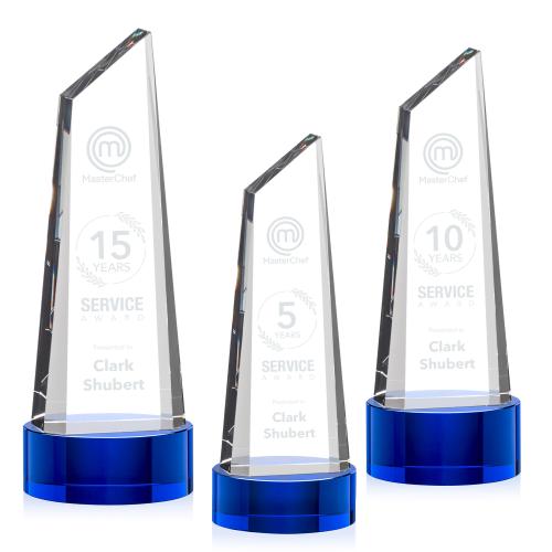 Stunning trapezoidal tower award is anchored with a thick optical crystal bottom that tapers to a peak. Mounted on your choice of Clear, Emerald, Ebony, or Sapphire Optical Crystal base. Experience a new glimmer of radiant light at each angle of this exquisite crystal award.