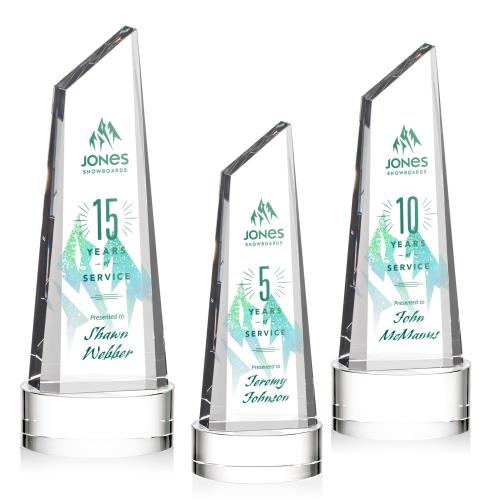 Stunning trapezoidal tower VividPrint award is anchored with a thick optical crystal bottom that tapers to a peak. Mounted on your choice of Clear, Emerald, Ebony, or Sapphire Optical Crystal base. Experience a new glimmer of radiant light at each angle of this exquisite crystal award. Let your message POP! with full-color VividPrint.