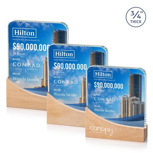 Celebrate excellence with our striking Starfire Crystal Cadott VividPrint Award, featuring sleek rectangle shape with curved top corners for a modern aesthetic. Resting atop a beechwood base gracefully sculpted to create a gentle slope, this award exudes sophistication and prestige. Elevate your recognition ceremonies with this timeless symbol of achievement, where craftsmanship meets elegance in perfect harmony. Second-position imprint on base optional.