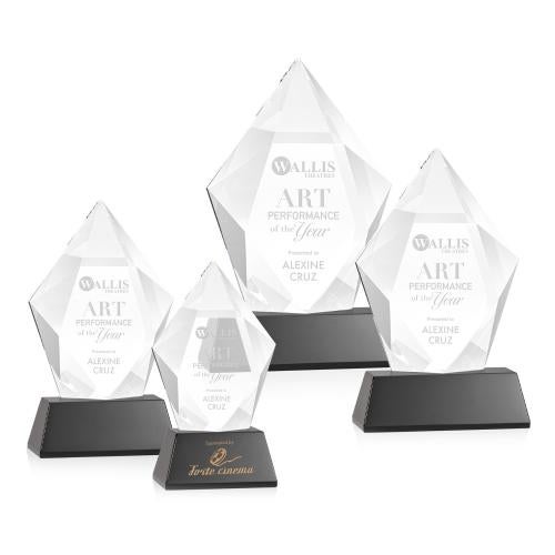 The spectacular and sparkling Devron Award features a thick Optical Crystal pentagon with deep facets creating a halo for refracted light around your inspirational words of achievement. Mounted on a tall tapered optical base in your choice of 8 distinct colors. Second position etch and colorfill optional.