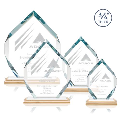 The Royal Diamond is a symmetrical six-sided Starfire award with constant-width bevels on the front top and bottom sides and on the back middle sides. The prominent, highly polished bevels accentuate the sparkle of the glass, generate diverse and attractive reflections along the edges, and frame the central etching area. Mounted on a triple-stepped bamboo base.