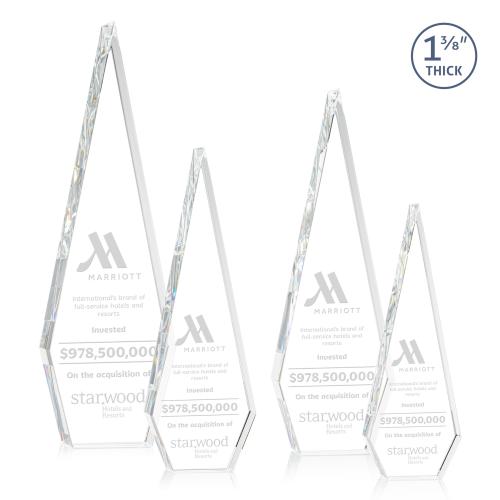This Optical Crystal Springfield Award features an elongated, tall diamond-shape, standing **1 3/8 inches thick.** The sleek and freestanding design exudes elegance and sophistication, making it an eye-catching centerpiece for any display. Its flawless clarity and precision-cut edges reflect light beautifully, highlighting the craftsmanship and significance of the accolade.