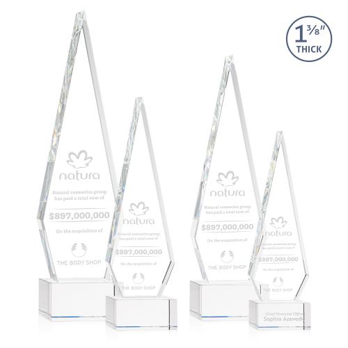 This Optical Crystal Springfield Award on base features an elongated, tall diamond-shape, standing **1 3/8 inches thick.** The sleek design exudes elegance and sophistication, making it an eye-catching centerpiece for any display. Its flawless clarity and precision-cut edges reflect light beautifully, highlighting the craftsmanship and significance of the accolade. Available with various bases. 2nd position etching is optional.