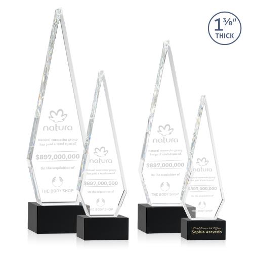 This Optical Crystal Springfield Award on base features an elongated, tall diamond-shape, standing **1 3/8 inches thick.** The sleek design exudes elegance and sophistication, making it an eye-catching centerpiece for any display. Its flawless clarity and precision-cut edges reflect light beautifully, highlighting the craftsmanship and significance of the accolade. Available with various bases. 2nd position etching optional.