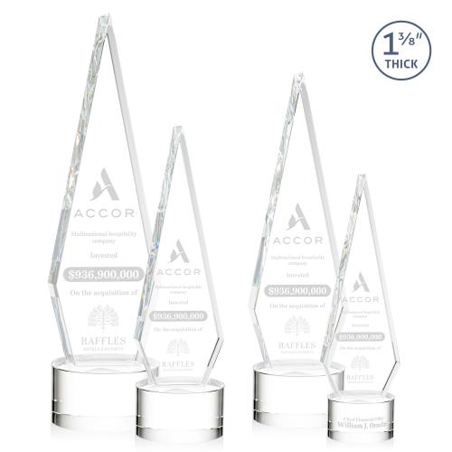 This Optical Crystal Springfield Award on base features an elongated, tall diamond-shape, standing **1 3/8 inches thick.** The sleek design exudes elegance and sophistication, making it an eye-catching centerpiece for any display. Its flawless clarity and precision-cut edges reflect light beautifully, highlighting the craftsmanship and significance of the accolade. Available with various bases. 2nd position etching optional.