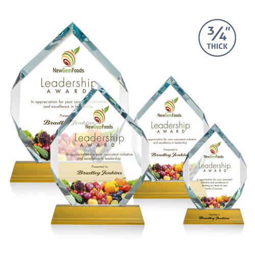 The Royal Diamond VividPrint is a symmetrical six-sided Starfire award with constant-width bevels on the front top and bottom sides and on the back middle sides. The prominent, highly polished bevels accentuate the sparkle of the glass, generate diverse and attractive reflections along the edges, and frame the central etching area. The award is mounted onto a tall tapered Optical Amber Base. Second position imprint optional.