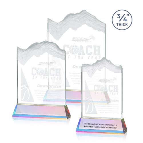The stunning Kilimanjaro award features deep carved and frosted peaks in 3/4" thick Starfire Crystal. Mounted on the tall tapered Optical Crystal Newhaven Base. A perfect award for a momentous achievement. 2nd position etch and color optional.
