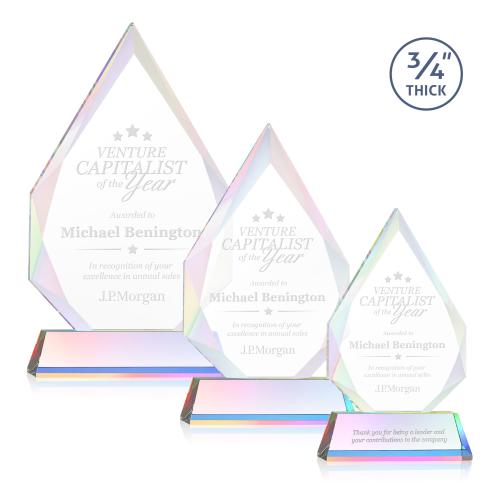 The classic Hawthorne 3/4" thick Starfire Crystal Award is the pinnacle of achievement recognition. Brilliantly beveled to highlight your message with interchanging facets that rise to a sparkling peak. Available on your choice of clear or colored tall tapered base. Second Position Etch & Colorfill optional.
