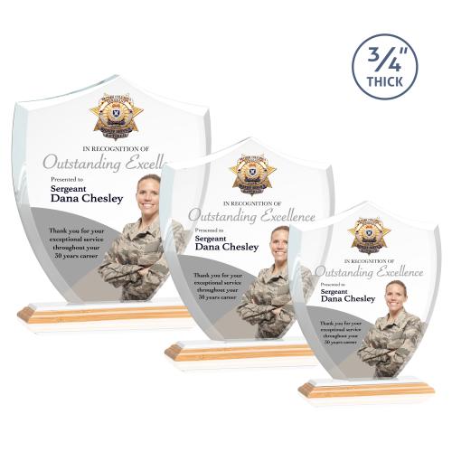 A shield signifies protection, authority, and stability, making the Scudo Shield VividPrint Award suitable for recognizing outstanding excellence for first responders and law enforcement. This Starfire Crystal Award features beveled edges and is mounted on a Bamboo Base. Let your message POP with full-color VividPrint!