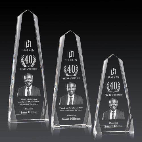 The freestanding Optical Crystal Geneva 3D Award is an obelisk that features a mesmerizing design with interchanging bevels, lending it a dynamic and captivating appearance. Each facet catches and reflects light, creating a dazzling display that symbolizes the multifaceted nature of success. Take our deep etch process even deeper with our incredible subsurface Dimensions 3D Engraving.