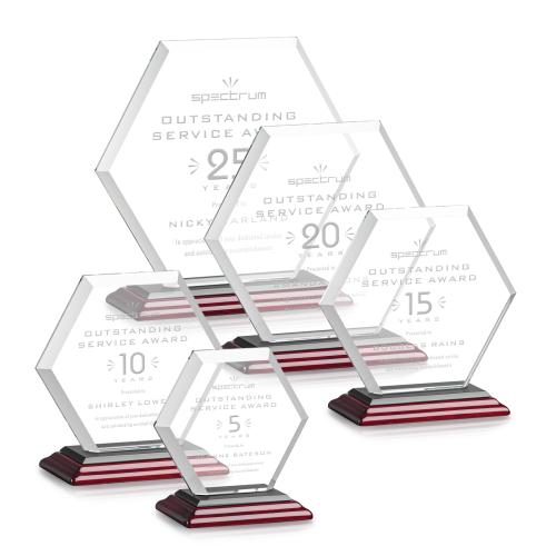 The Barnett Award features a beautifully beveled Starfire Crystal Hexagon mounted on a triple-stepped piano-finished rosewood base. The large decorating area is highlighted by the deep mitered edges that frame your outstanding achievement with refracted light.