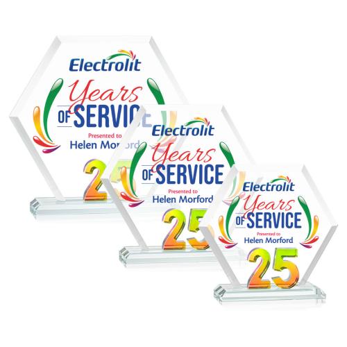 Mark a milestone in your organization with our Starfire Crystal Riviera Anniversary VividPrint Award. The unique hexagonal design, coupled with beveled edges, creates a modern and sophisticated aesthetic, reflecting the significance of the years served. At the heart of this remarkable award lies captivating prismatic number 25, showcasing the years of significance. Mounted on a clear beveled Starfire Crystal base. Take your artwork to new heights with full-color VividPrint!
