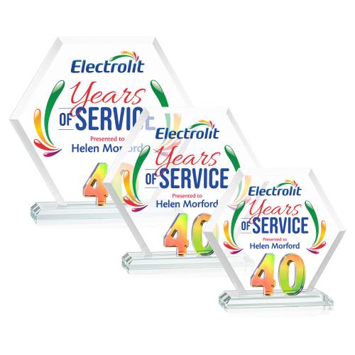 Mark a milestone in your organization with our Starfire Crystal Riviera Anniversary VividPrint Award. The unique hexagonal design, coupled with beveled edges, creates a modern and sophisticated aesthetic, reflecting the significance of the years served. At the heart of this remarkable award lies captivating prismatic number 40, showcasing the years of significance. Mounted on a clear beveled Starfire Crystal base. Take your artwork to new heights with full-color VividPrint!