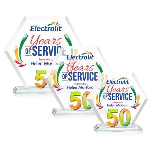 Mark a milestone in your organization with our Starfire Crystal Riviera Anniversary VividPrint Award. The unique hexagonal design, coupled with beveled edges, creates a modern and sophisticated aesthetic, reflecting the significance of the years served. At the heart of this remarkable award lies captivating prismatic number 50, showcasing the years of significance. Mounted on a clear beveled Starfire Crystal base. Take your artwork to new heights with full-color VividPrint!